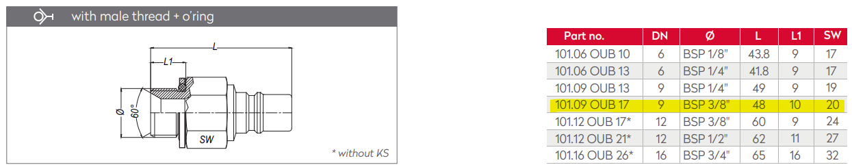 Série: 101 Použití: systémy chlazení forem v plastikářském průmyslu nebo pro rozvody vody a oleje Typ zakončení (OUB): Jedná se o vsuvku (zástrčku) s vnějším závitem a uzavíracím ventilem Velikost závitu: BSP 3/8" Jmenovitý průtok (DN): 9 mm Materiál: Standardně mosaz (případně nerezová ocel na vyžádání)